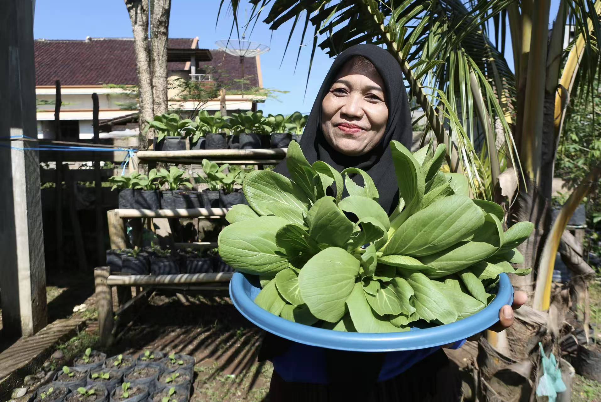 2025年10月4日,印度尼西亚南苏门答腊省麻拉埃宁县丹戎拉朗村第三村民小组的卡斯米娜在家中后院展示刚采摘的上海青。新华社记者叶平凡摄在电厂周边乡村,玻雅公司还实施“绿色乡村”项目。通过与当地大学合作,该项目引导村民在房前屋后空地种植有机蔬菜,邀请农业专家为村民提供种植技术培训,协助建立稳定的销售渠道,将农产品直接供应至玻雅电厂及附近企业。