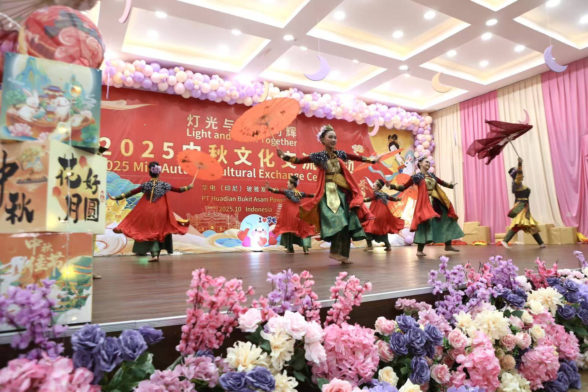 2025年10月3日,在位于印度尼西亚南苏门答腊省麻拉埃宁县的华电(印尼)玻雅发电公司电厂文体活动中心举行的中秋文化交流活动上,女员工正在表演舞蹈。新华社记者叶平凡摄印尼苏门答腊岛盛产煤矿,当地发展却长期受制于电力供应不足。2012年,中国华电海外投资有限公司与印尼国营的布基特阿萨姆煤矿公司合资成立玻雅公司,并开始筹备坑口电厂项目。2023年10月,该项目正式并网发电。