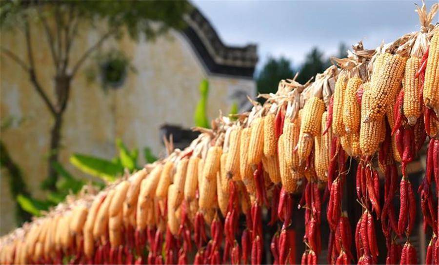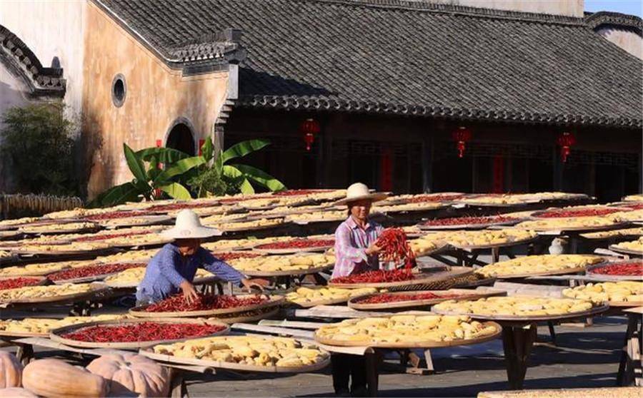 漫步在这座古村,时光仿佛在此放慢了脚步。徽派古建的屋檐下、窗台上、晒场上,处处都铺满了丰收的喜悦:火红的辣椒似跳跃的火焰,金黄的玉米如灿烂的阳光,橙黄的南瓜像圆润的灯笼。这些鲜活的色彩与白墙黛瓦的徽派建筑相映成趣,勾勒出一幅独具徽州风情的秋日画卷。村民们娴熟地翻晒着各类农作物,指尖的动作不仅是对传统农耕文化的坚守与传承,更让这幅秋日图景有了温度,成为古村中一道靓丽又动人的风景线。