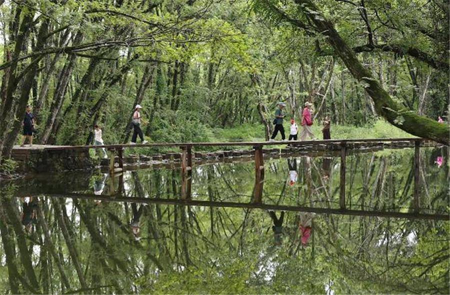 如果说呈坎古村的秋是“色彩斑斓的诗意”,那被誉为“现实版绿野仙踪”的西溪南村,便藏着“绿意盎然的浪漫”。即便到了秋日,西溪南村的林间依旧绿意葱茏,阳光透过枝叶的缝隙洒下,在地面形成斑驳的光影。平静的丰乐河水如镜子般倒映着蓝天、白云与树木,行走其间,仿佛踏入了缥缈的仙境,让人忘却尘世的喧嚣。这片引人入胜的生态秘境,不仅让游客们沉浸式感受古村的生态之美,更在移步换景间,让人读懂了西溪南村深藏的人文底蕴。