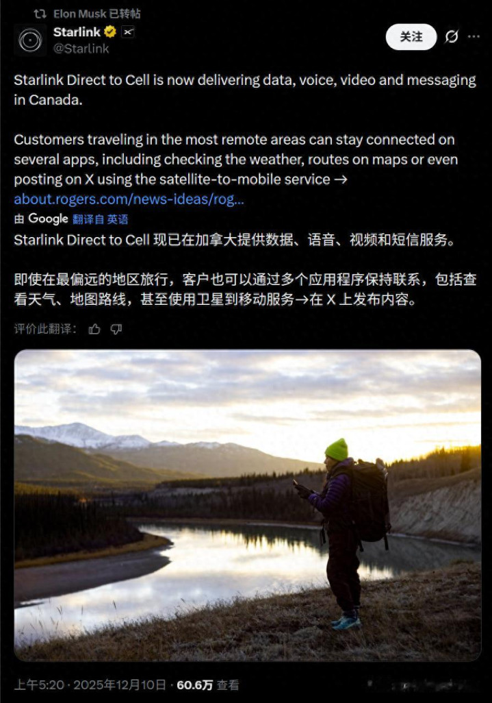深入剖析,这一服务源于SpaceX的低轨卫星网络,摒弃传统地面基站依赖,转而利用卫星直接与手机天线对话。不同于早期测试阶段的局限,如今已转为付费模式,部分Rogers套餐用户免费接入。这填补了加拿大广袤荒野的“信号黑洞”——想想那些徒步探险者、渔民或偏远社区居民,过去信号中断可能酿成悲剧,如今却能随时求援或分享瞬间。帖子配图生动捕捉了这一变革:手机屏幕上清晰显示卫星连接图标,象征“无处不在”的自由。